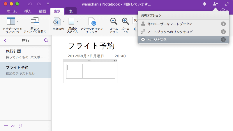 - 該当するページを開き、[共有]から[ページを送信]を選択します。