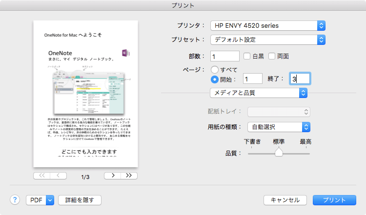 - [ファイル]メニューの[プリント]をクリックするか、Command + P キーを押します。