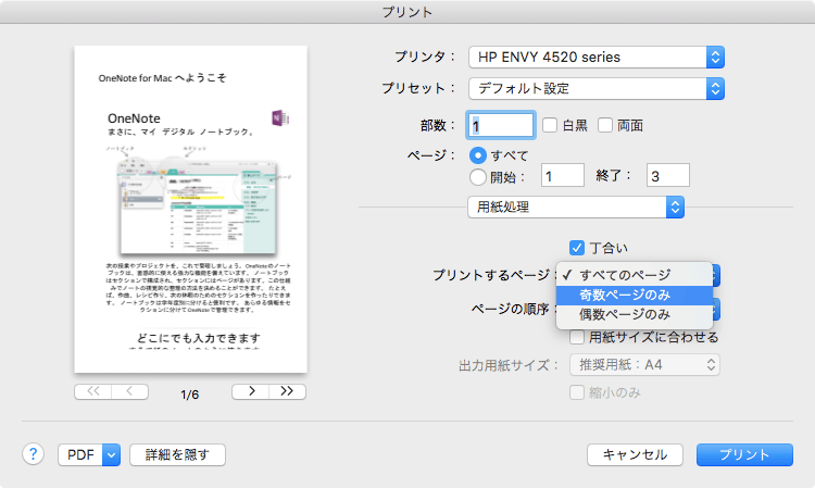 [プリント]ダイアログボックスの[レイアウト]を[用紙処理]に変更し、[すべてのページ]から[奇数ページのみ]または[偶数ページのみ]を選択して[プリント]ボタンをクリックするとOKです。