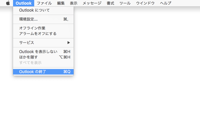 - [Outlook]メニューの[Outlookの終了]を選択するか、Commandキーを押しながらQキーを押します。
