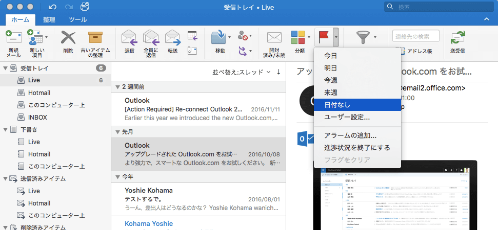 Outlook 2016 for Macでフラグを設定したいアイテムを選択し、[ホーム]タブの[フラグの設定]をクリックすると、今日が期限のフラグを付けることができます。アイテムを選択したときに右上のフラグをクリックすることで、すばやくフラグを設定することもできます。そのフラグをクリックすると、進捗状況を終了でき、さらにクリックするとフラグをクリアにできます。期限なしのフラグを付ける場合、[ホーム]タブの[フラグの設定]の▼をクリックして[日付なし]を選択するとOKです。そのフラグをクリアするには、[ホーム]タブの[フラグの設定]の▼をクリックして[フラグをクリアする]をクリックします。