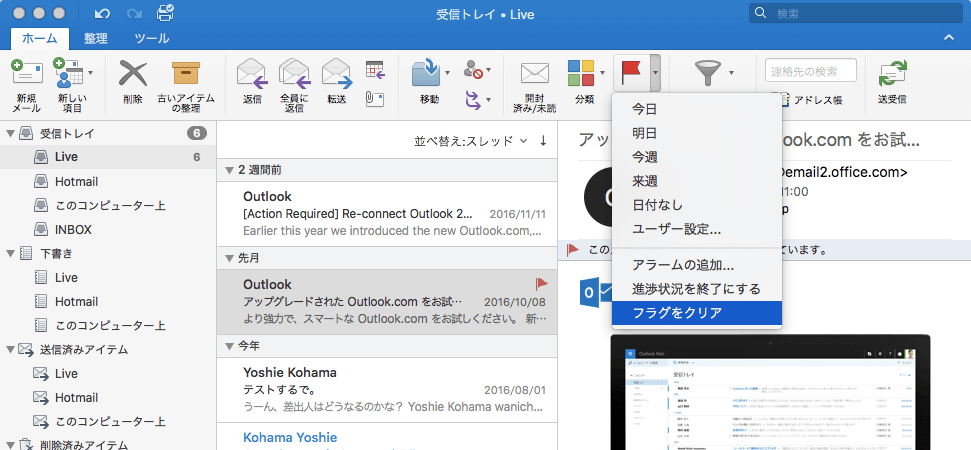 - [ホーム]タブの[フラグの設定]の▼をクリックして[フラグをクリア]をクリックします。