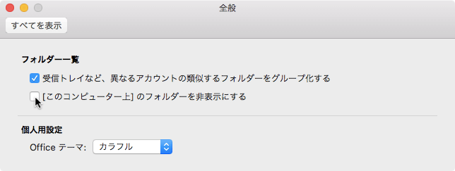 POPアカウントがなく、GmailやOutlook.com等、直接サーバーと接続するアカウントだけが存在する場合は、[このコンピューター上]のフォルダーは使われません。そこで、この使われないフォルダーを非表示にすることができます。Outlook 環境設定の[全般]オプションで、[[このコンピューター上]のフォルダーを非表示にする]のチェックを付けるとOKです。