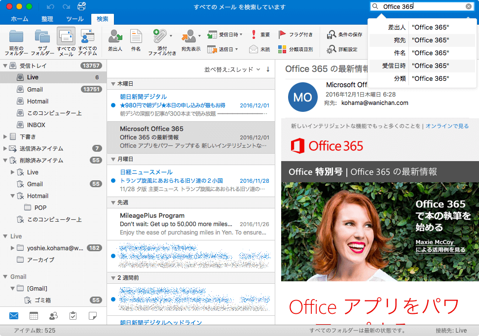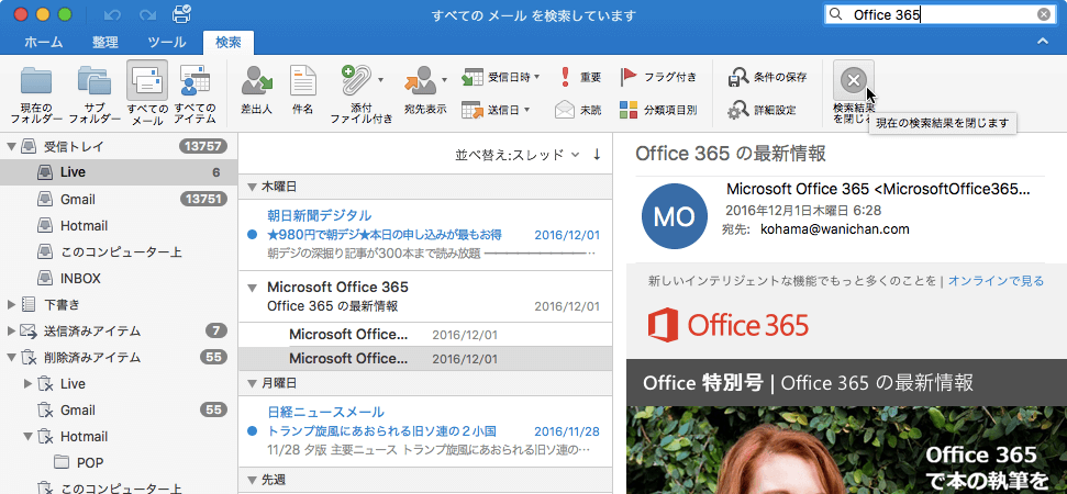 - キーワードを入力すると、そのキーワードを含むメールアイテムの一覧が表示されました。