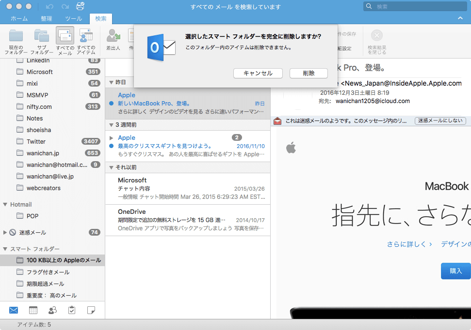 スマートフォルダーから条件を削除するには、対象となる条件を右クリックしてショートカットメニューより[削除]をクリックします。すると、確認メッセージが表示されるので[削除]ボタンをクリックします。