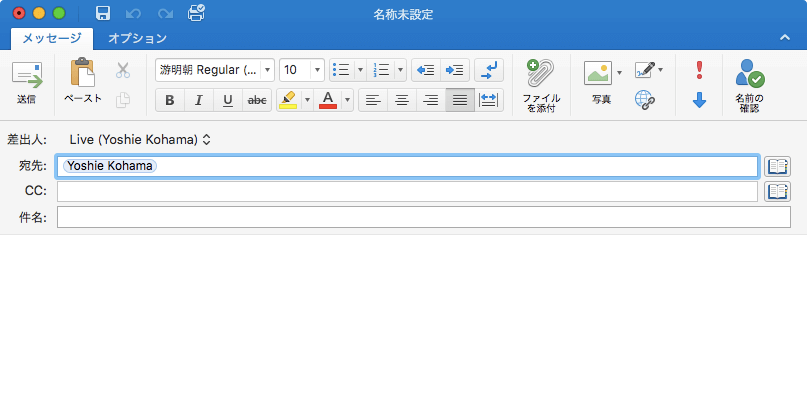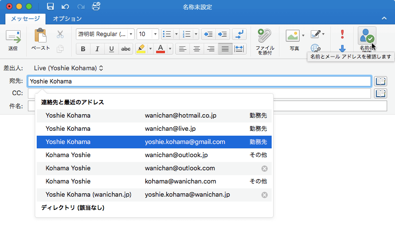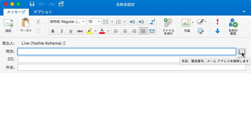 - [宛先]ボックスに名前を入力して[メッセージ]タブの[名前の確認]をクリックします。