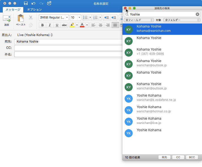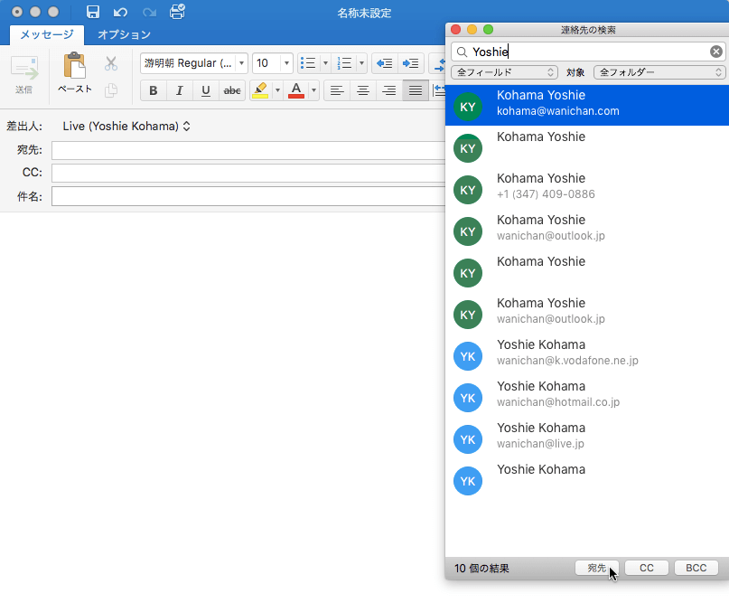名前を入力し、宛先を選択して、宛先、CC、BCCのうちいずれかのボタンを押します。ここでは、宛先ボタンをクリックします。