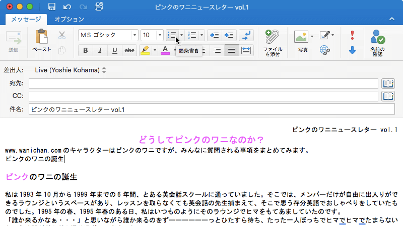 - 箇条書きにしたい段落にカーソルを移動して、[メッセージ]タブの[箇条書き]をクリックします。
