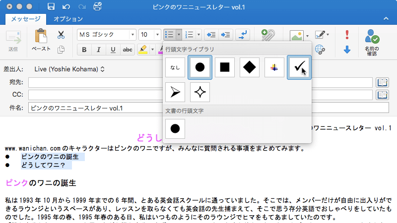 Outlook 2016 for Macで[メッセージ]タブの[箇条書き]ボタンを押すことで、通常の段落から箇条書きに変更できます。なお、[箇条書き]ボタンの▼をクリックして、他の箇条書きスタイルを指定することもできます。箇条書きレベルを下げるにはTabキー、逆にレベルを上げるにはShiftキーを押しながらTabキーを押します。