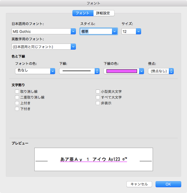 - [フォント]ダイアログボックスの[下線]オプションにて、下線スタイルを選択します。