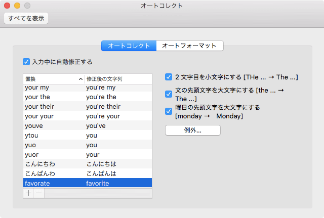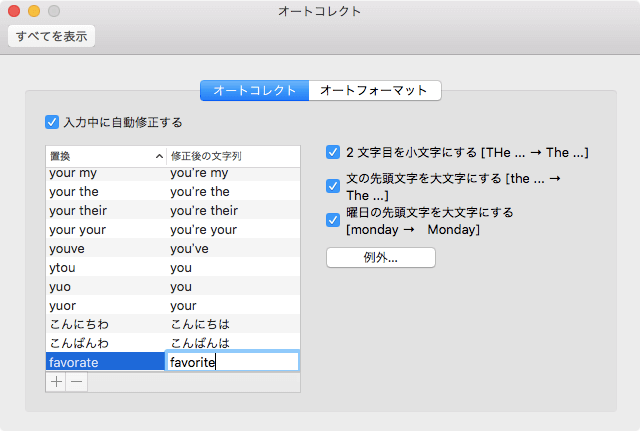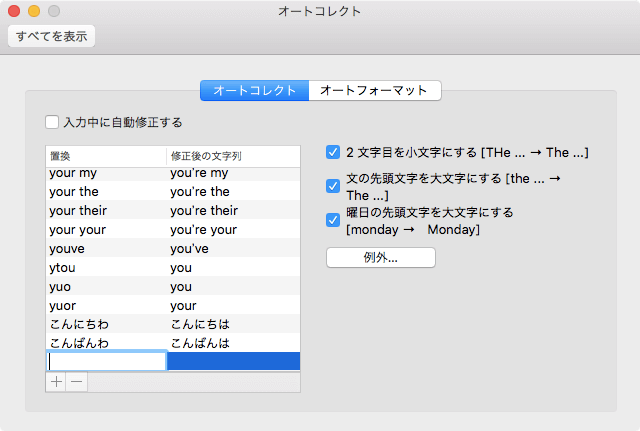 [オートコレクト]ウィンドウの[オートコレクト]タブが開いたら、[入力中に自動修正する]にチェックがついていることを確認して、左下の[+]をクリックします。