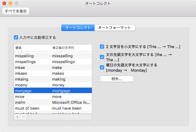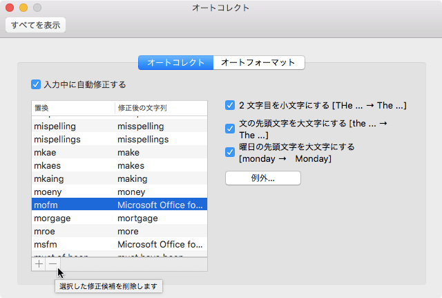 [オートコレクト]ウィンドウの[オートコレクト]タブが開いたら、削除したい修正候補を選択して、左下の[-]をクリックします。