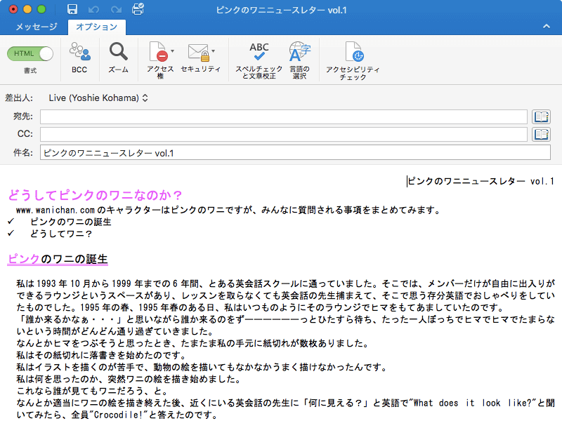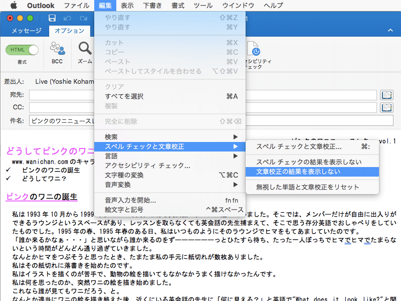 Outlook 2016 for Macで未送信メッセージ本文上に文法上に問題がある箇所は青の二重下線で表示されます。これを非表示にするには、[編集]メニューの[スペルチェックと文章校正]をポイントして[文章校正の結果を表示しない]にチェックを付けます。