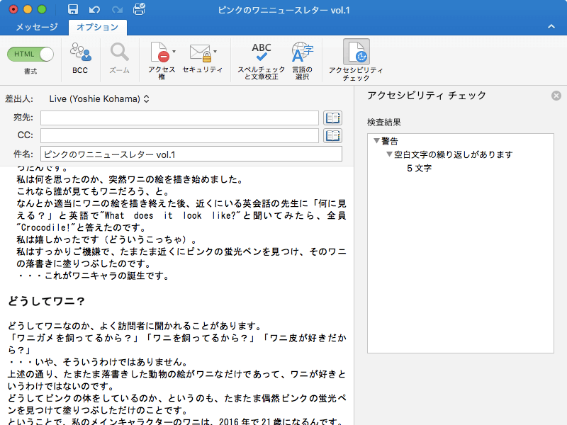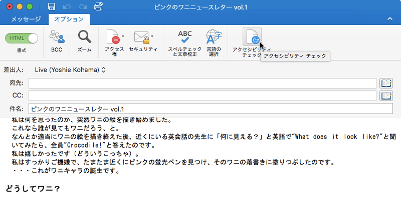 対象となるメールメッセージウィンドウを開き、[オプション]タブの[アクセシビリティチェック]をクリックするか、[編集」メニューの[アクセシビリティチェック]を選択します。