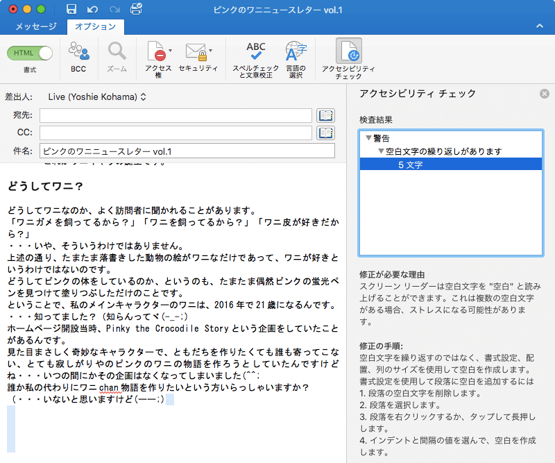 障碍のある方がスクリーンリーダーを使用して受信メールを読む場合、問題があるかどうかをチェックするには、アクセシビリティチェック機能を利用するとよいでしょう。[オプション]タブの[アクセシビリティチェック]をクリックするか、[編集」メニューの[アクセシビリティチェック]を選択します。