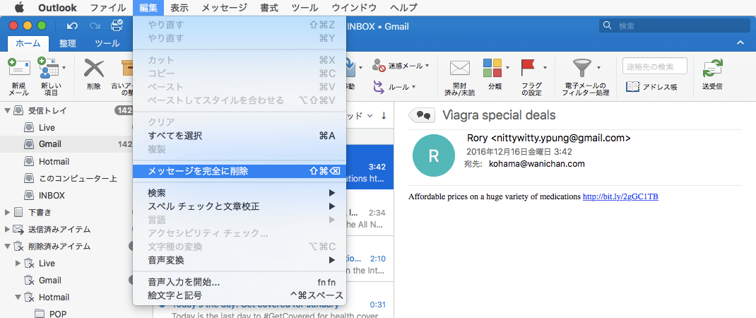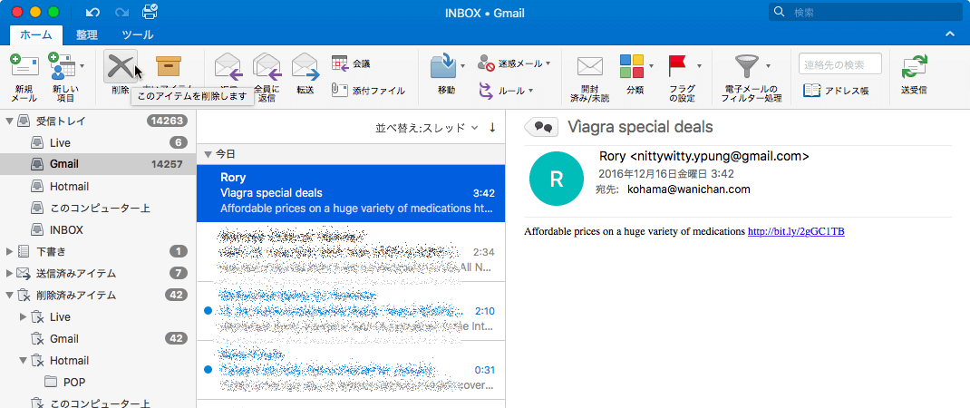Outlook 2016 for Macで選択したメッセージを削除するには、[ホーム]タブの[削除]をクリック、deleteキーを押す、もしくは[編集]メニューの[削除]を選択します。削除されたメッセージは[削除済みアイテム]フォルダーに移動されます。Shiftキーを押しながら押すと、[削除済みアイテム]フォルダーに移動されずに完全削除になります。