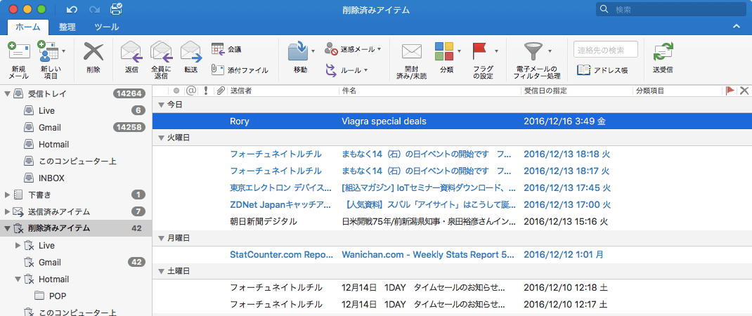 - 選択したメッセージが削除済みアイテムに移動されました。