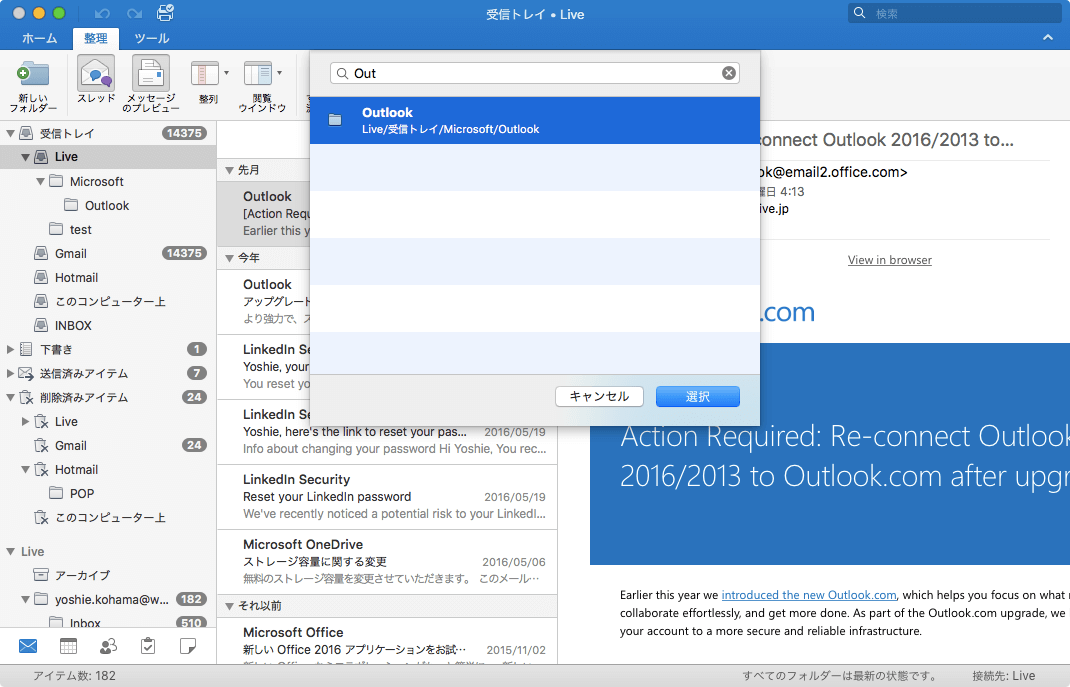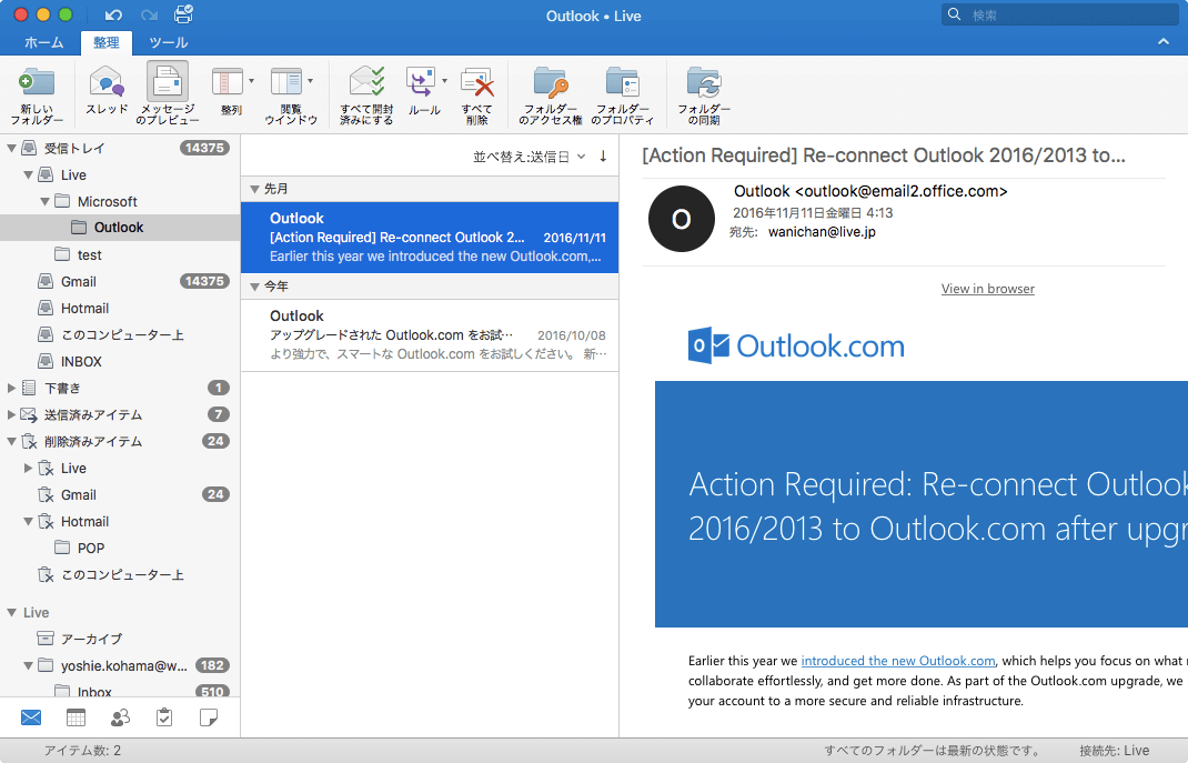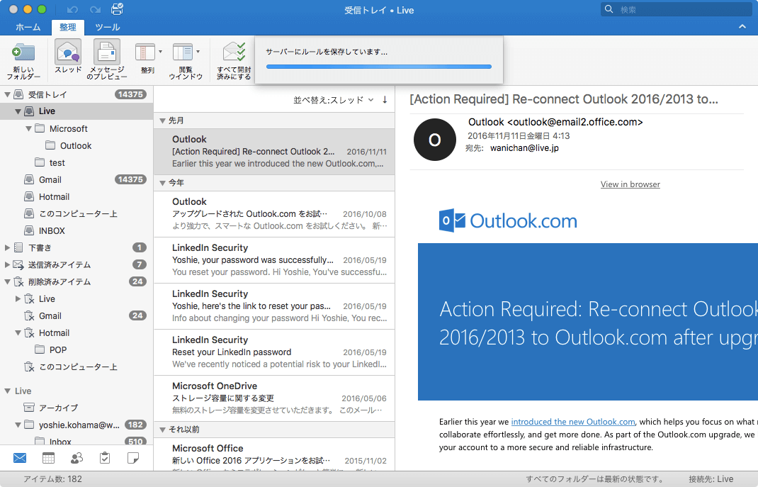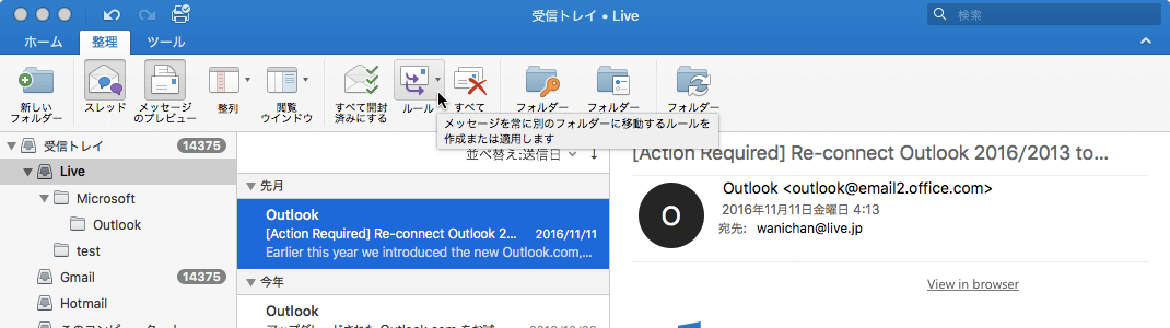 Outlook 2016 for MacでOutlook.comと接続されたアカウントで、選択したメッセージの差出人を基にルールを作成し、メールが常に別のフォルダーに移動されるようにするには、[ホーム]タブまたは[整理]タブの[ルール]をクリックして、[次の差出人からのメッセージを移動]を選択し、移動先フォルダーを指定します。宛先の場合は[ホーム]タブまたは[整理]タブの[ルール]をクリックして、[次の宛先へのメッセージを移動]を選択します。