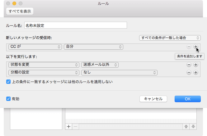 [新しいメッセージの受信時]の一番左側には[CCが]を選択し、[自分]を選択して、条件を追加します。