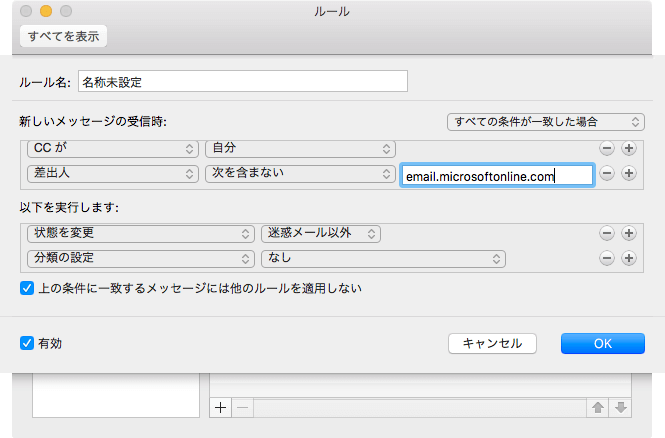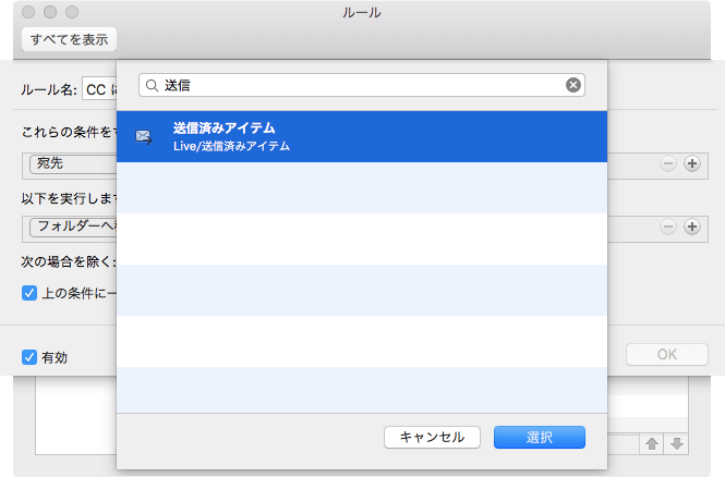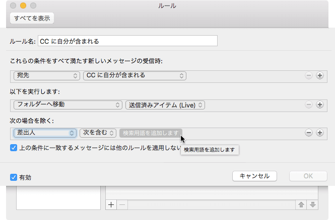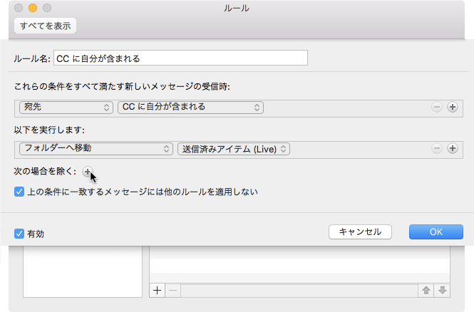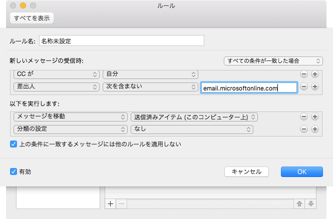 CCに自分の名前があり、特定の差出人以外のメールを送信済みアイテムに移動する