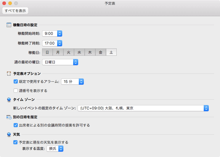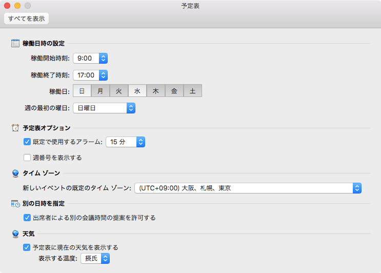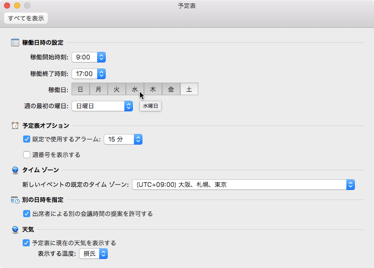 Outlook 2016 for Macの既定の稼働日は月曜日から金曜日までです。例えば日曜日は稼働日だけど水曜日を休みに変更したい場合、[Outlook]メニューの[環境設定]を選択して[Outlook 環境設定]の[予定表]を開き、稼働日をクリックして調整します。