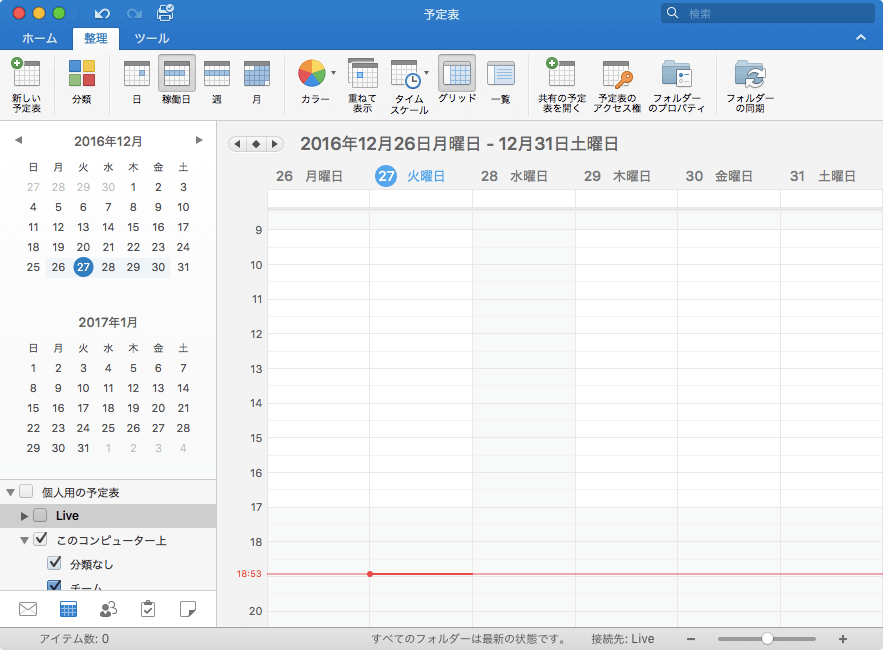 Outlook 2016 for Macの既定の稼働日は月曜日から金曜日までです。予定表で稼働日表示にした場合、月曜日から金曜日までが表示されます。