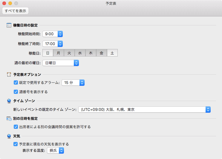 - [Outlook]メニューの[環境設定]を選択して[Outlook 環境設定]の[予定表]を開きます。