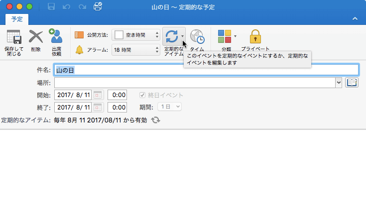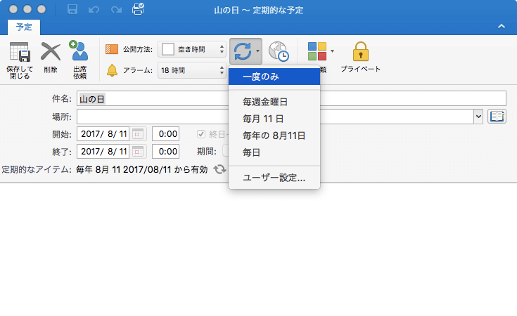 Outlook 2016 for Macで対象となる予定やイベントのアイテムを選択し、[定期的な予定]タブの[定期的なアイテムの編集]ボタンをクリックして、アイテムウィンドウの[定期的なアイテム]ボタン一覧から[一度のみ]を選択し、保存して閉じます。