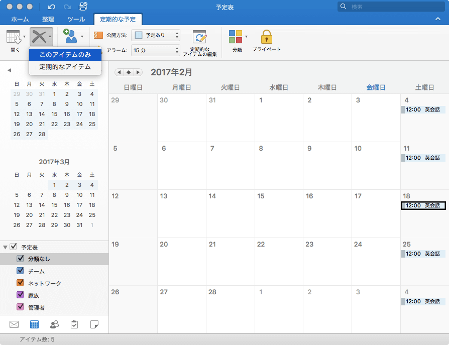 Outlook 2016 for Macで定期的な予定のうち選択したアイテムを削除するには、deleteキーを押すと確認メッセージが表示され、[削除]ボタンを押すとOKです。もしくは、該当するアイテムを選択し、[定期的な予定]タブの[削除]ボタンをクリックして[このアイテムのみ]をクリックします。
