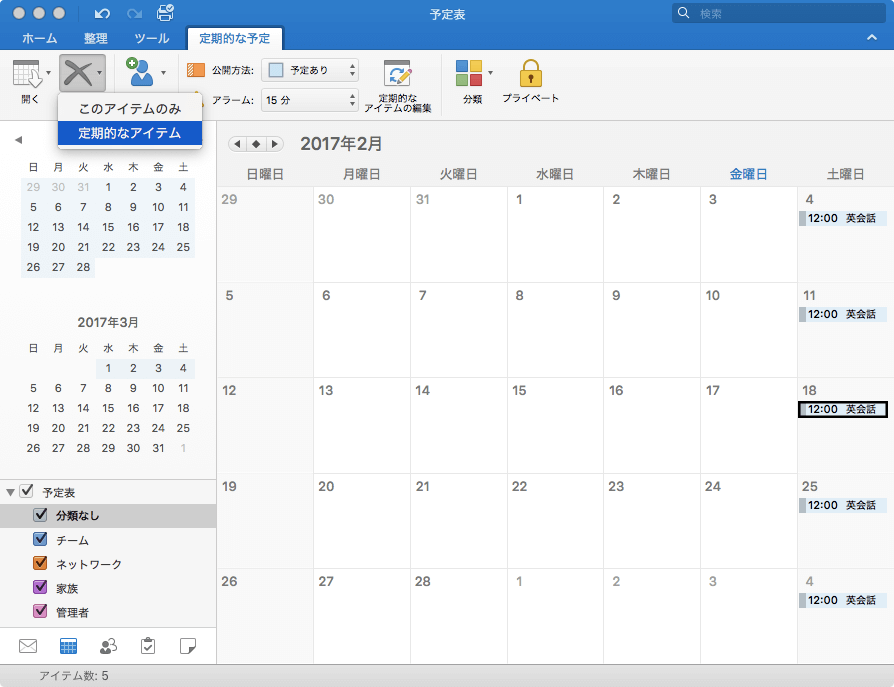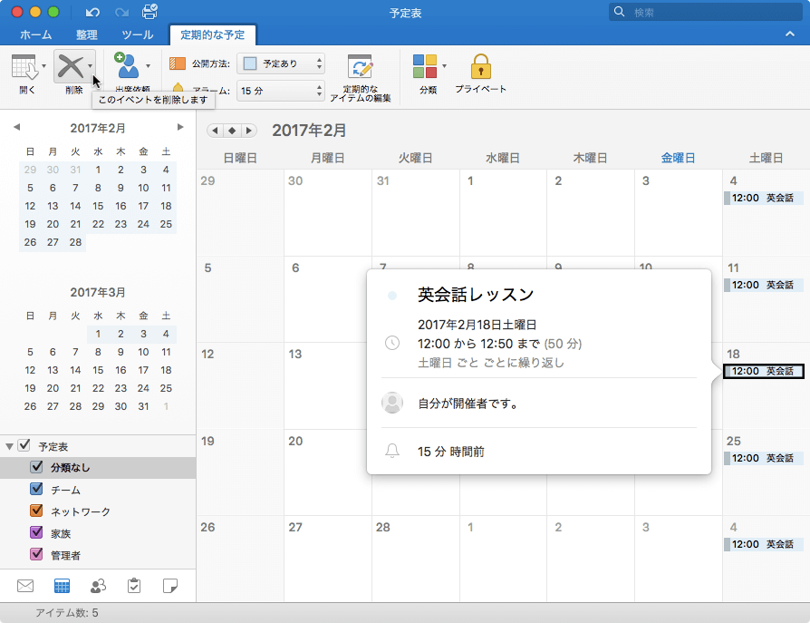 Outlook 2016 for Macでは、対象となる定期的な予定のうち一つを選択して[予定]タブの[削除]より[定期的なアイテム]を選択し、表示される確認メッセージで[削除]を選択します。指定日以降を削除する場合は、定期的なアイテムを開き、終了日を変更する必要があります。