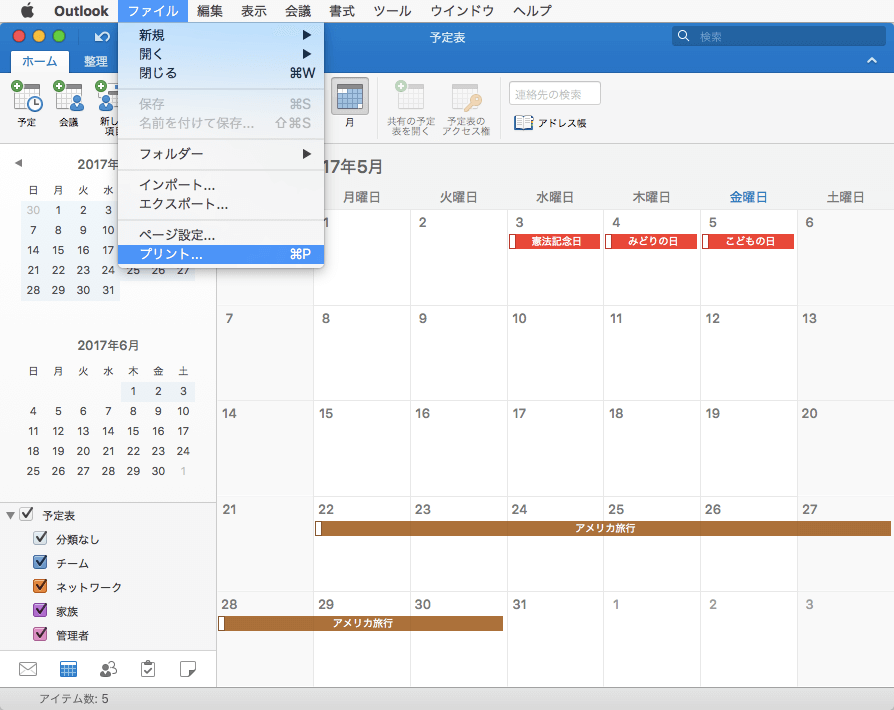 - 予定表を開き、[ファイル]メニューの[プリント]またはcommand+Pを押します。