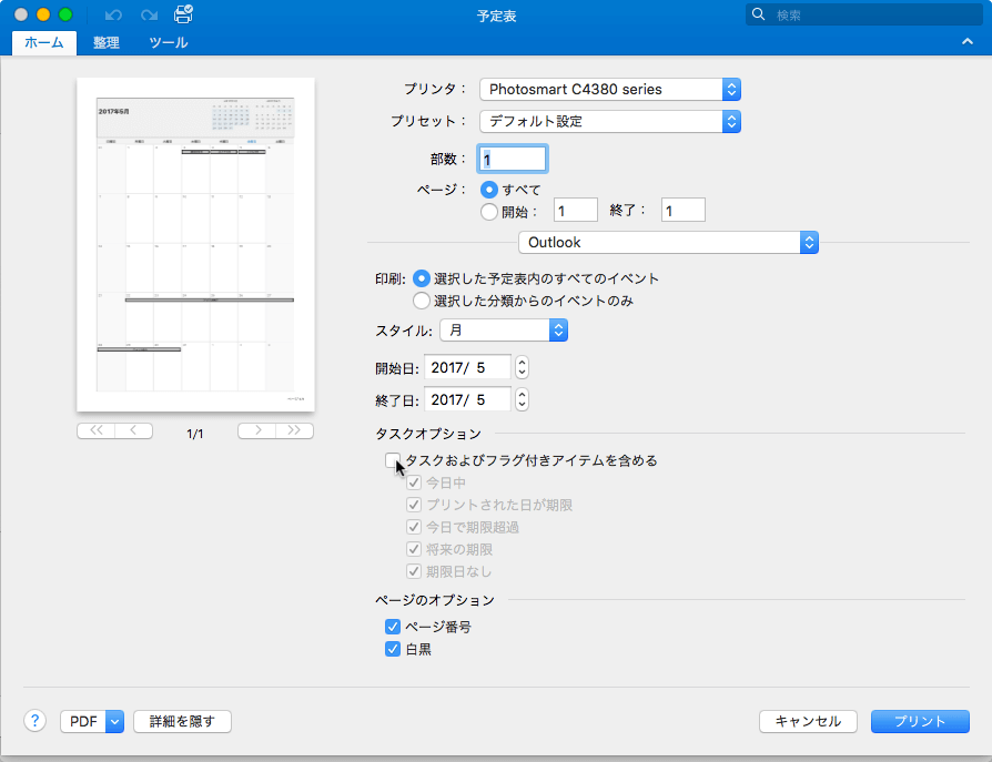 Outlook 2016 for Macでは、タスクやフラグ付きアイテムを含めて予定表を印刷することができます。予定表を開き、[ファイル]メニューの[プリント]またはcommand+Pを押して、プリント画面の[タスクおよびフラグ付きアイテムを含める]にチェックを入れて[プリント]ボタンをクリックします。