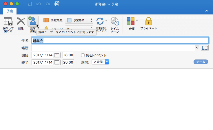 予定表に存在するイベントを他の人に招待することができます。対象となるイベントアイテムを選択し、[会議]メニューの[会議出席依頼]を選択、または[予定]タブの[出席依頼]をクリックするか、そのアイテムを開いて[予定]タブの[出席依頼]をクリックして、招待したい相手のメールアドレスとメッセージを入力し、送信すればOKです。Outlook 2016 for Macでの会議出席依頼のショートカットキーはshift+command+1です。