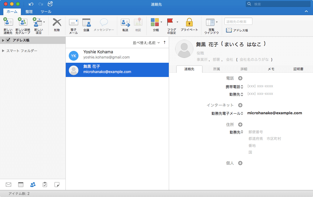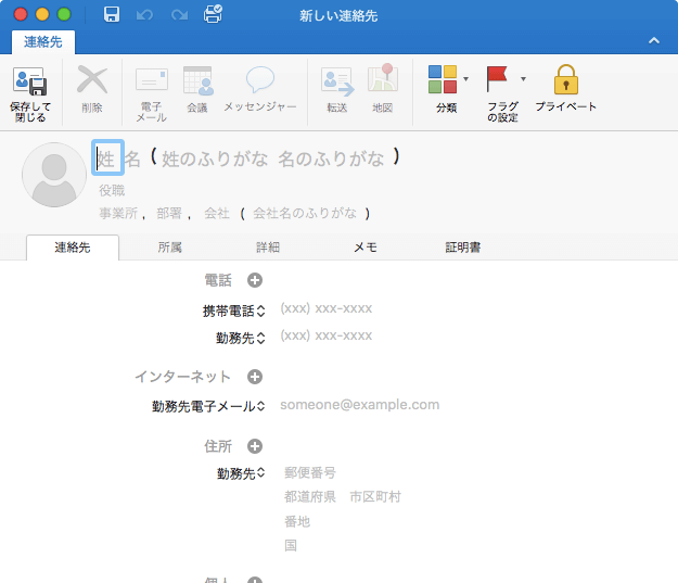 Outlook 2016 for Macで連絡先アプリを開き、[ホーム]タブの[新しい連絡先]をクリックするか、[連絡先]メニューの[新規]を選択します。ショートカットキーはcommand+Nです。