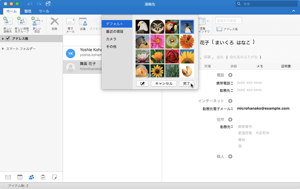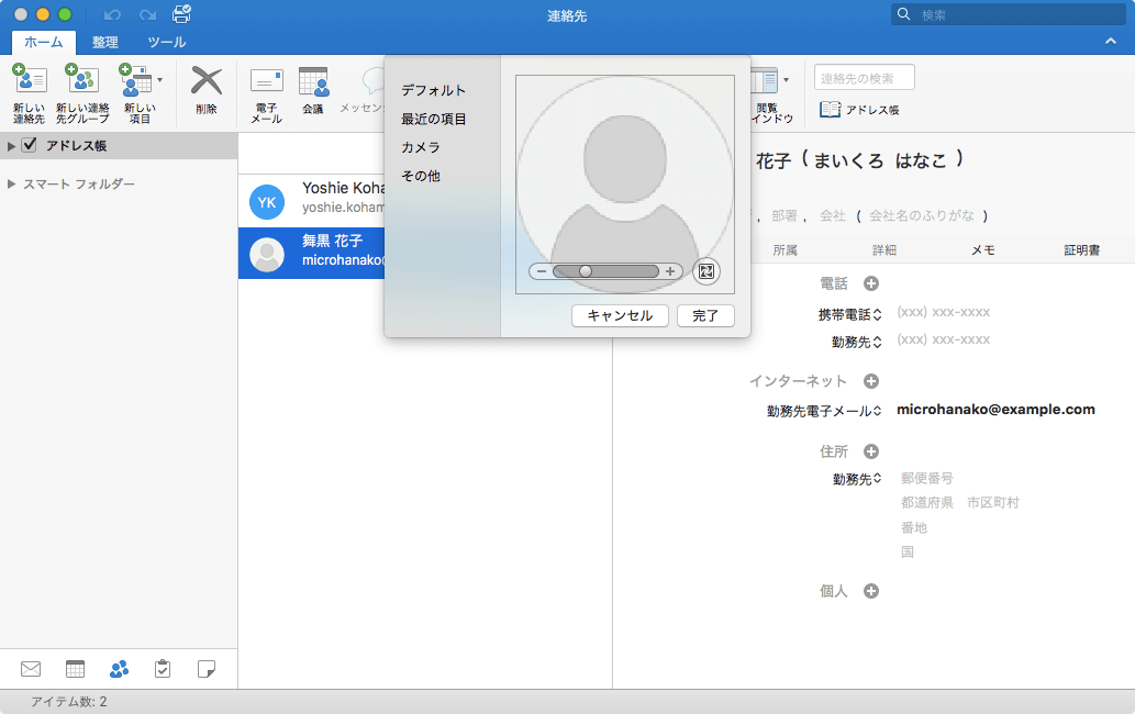 対象となる連絡先アイテムを選択して[連絡先]メニューの[連絡先の写真の編集]をクリックするか、写真アイコンをダブルクリックします。写真は[デフォルト]、[最近の項目]、[カメラ]、[その他]から選択できます。すでにオリジナルの写真ファイルを挿入する場合は[その他]をクリックして、対象となる写真を選択します。