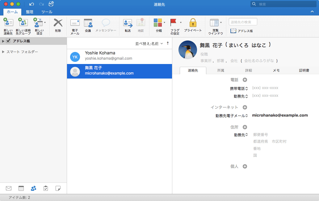 対象となる連絡先アイテムを選択して[連絡先]メニューの[連絡先の写真の編集]をクリックするか、写真アイコンをダブルクリックします。