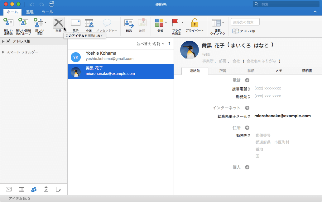 - 削除したい連絡先アイテムを選択して[ホーム]タブの[削除]をクリックするか、deleteキーを押します。