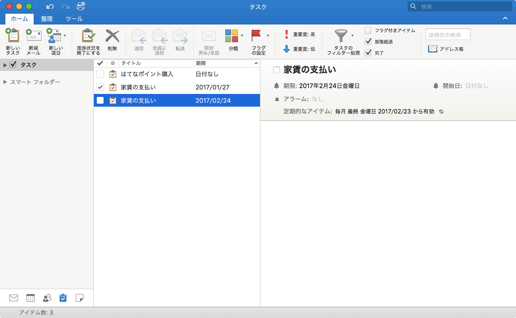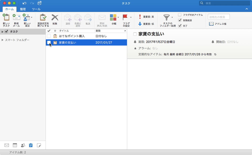 Outlook 2016 for Macで完了にしたいタスク一覧のチェックボックスにチェックすると簡単にそのタスクを進捗状況完了のマークを付けることができます。また、そのタスクアイテムを開いている場合は、[タスク]タブの[進捗状況を完了にする]をクリックします。