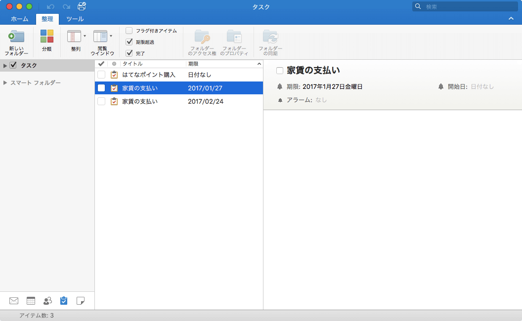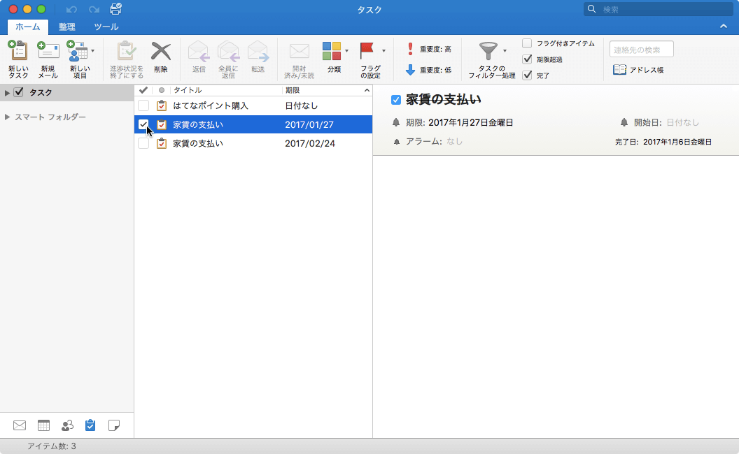 [進捗状況を完了にする]コマンドを選択して完了にしたタスクをアクティブ(未開始)に戻すには、チェックボックスのチェックを外すとOKです。定期的なタスクで一旦完了したアイテムを未完に戻すと、独立したタスクとして残ります。[進捗状況を完了にする]コマンドを選択して完了にした日がタスクの完了日となりますが、残念ながら、Outlook 2016 for Macではその完了日を変更することはできません。
