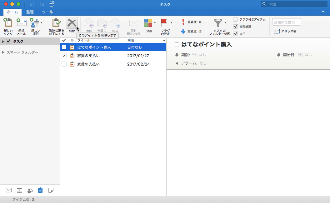 - 対象となるタスクアイテムを選択して[削除]をクリックします。
