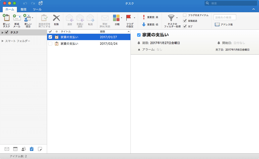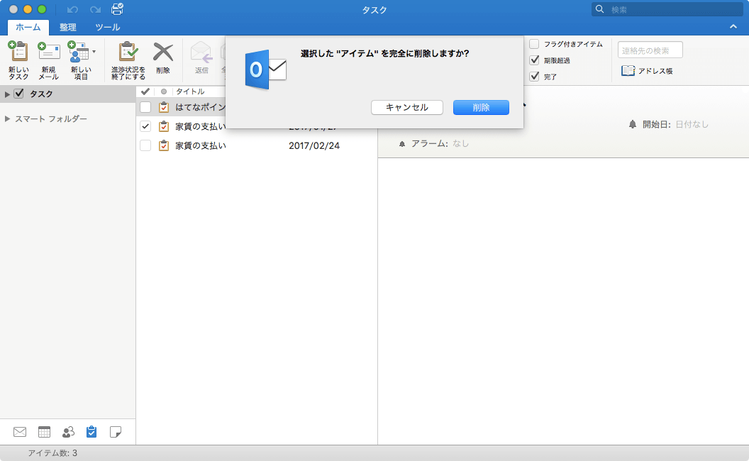 Outlook 2016 for Macでは対象となるタスクアイテムを選択して[削除]をクリックするか、そのタスクアイテムを開いて[削除]をクリックすると、削除したら元に戻せないとの確認メッセージが表示されます。そこで[削除]ボタンをクリックするとはじめてタスクが削除されます。