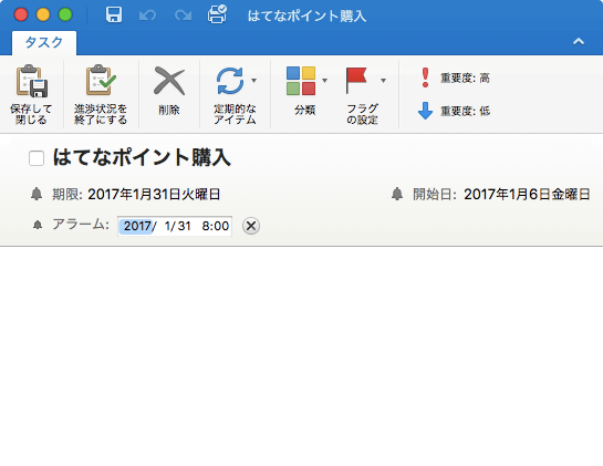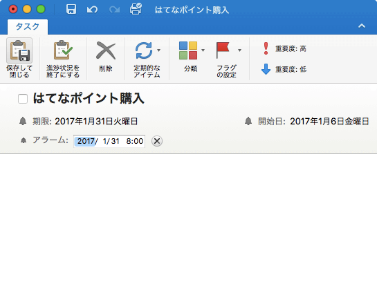 Outlook 2016 for Macでは、対象となるタスクアイテムを開き、[アラーム]のところをクリックしてアラームの日時を指定して[保存して閉じる]ボタンをクリックします。