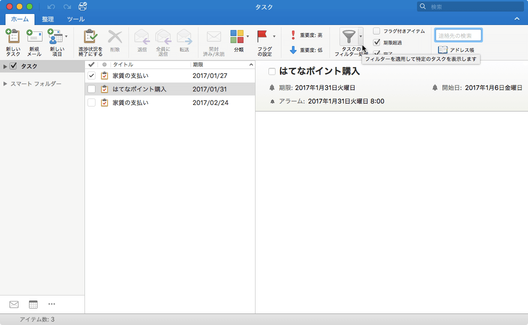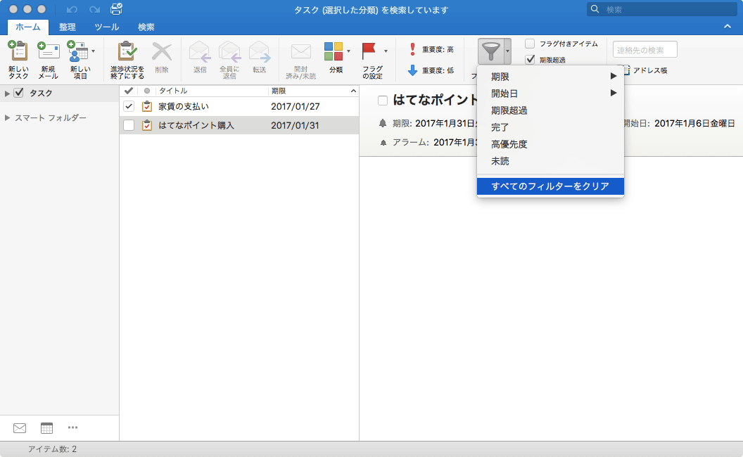 - [ホーム]タブの[タスクのフィルター処理]の▼をクリックし、[すべてのフィルターをクリア]を選択します。