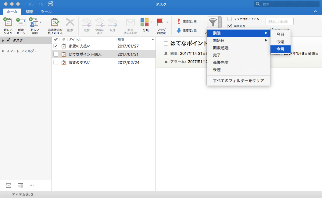 - 一覧から[期限]をポイントして[今月]を選択します。