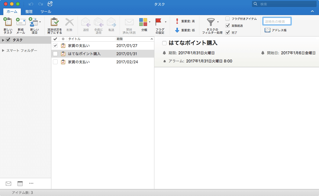 - [ホーム]タブの[完了]のチェックボックスをクリックします。