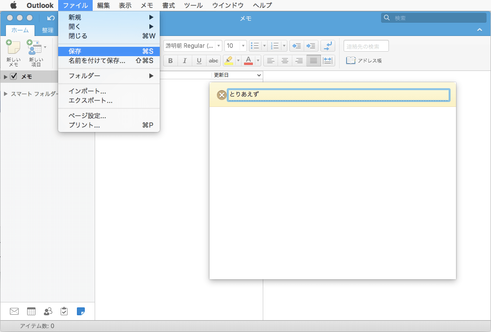 Outlook 2016 for Macにもメモアプリはありますが、Windows版のOutlookとは仕様が異なります。Outlook版の場合は自動保存されず、メモの背景色を変更することもできませんが、タイトルと本文に分かれてそれぞれ書式を加えることができます。まず、メモを作成するにはメモアプリを開いて[ホーム]タブの[新しいメモ]をクリックして、メモのタイトルを入力して保存します。