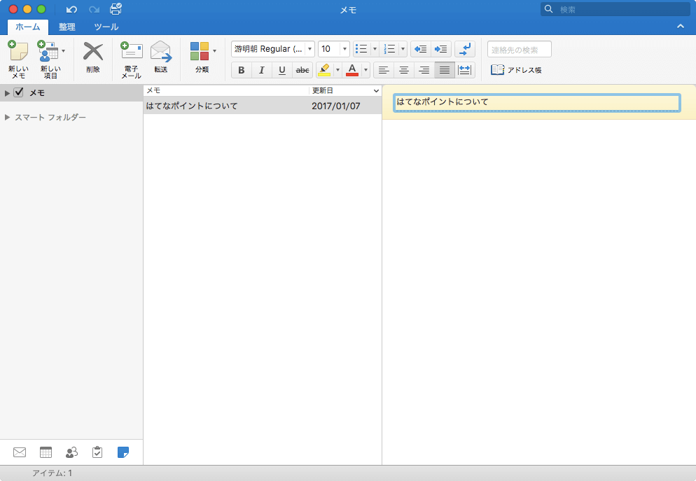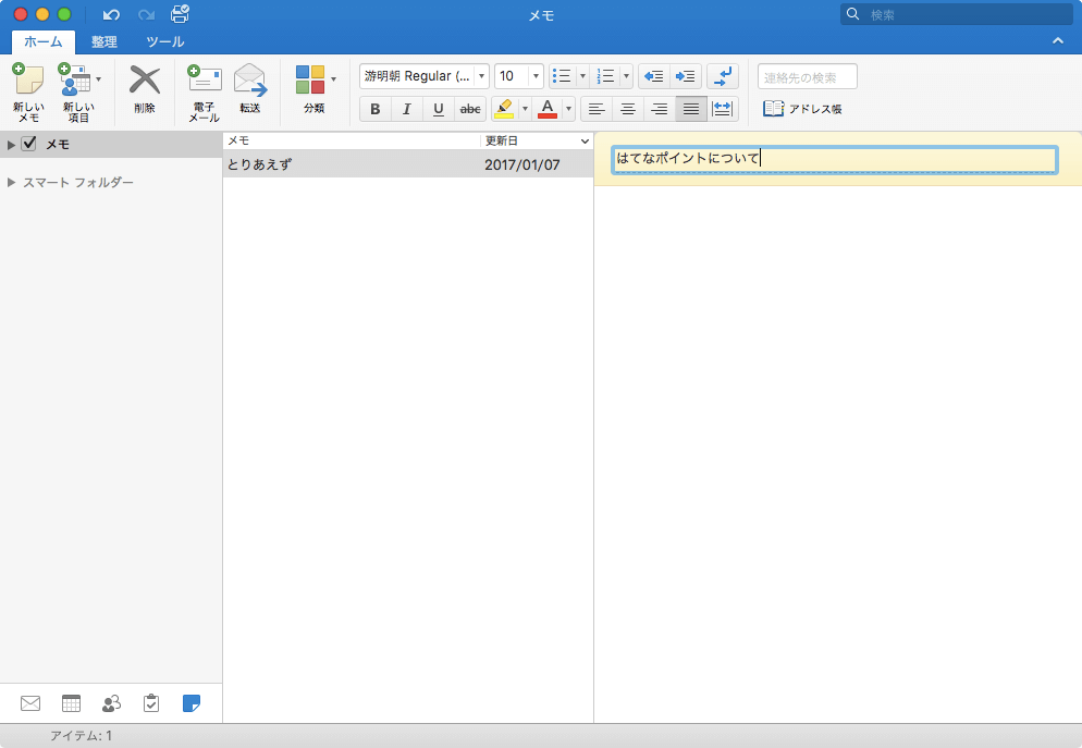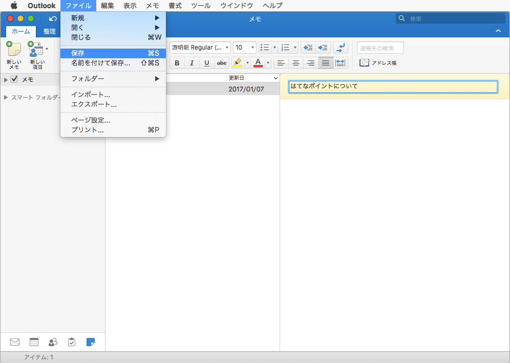 Outlook 2016 for Macでメモを作成して閉じた後は、メモを開かなくてもメモを更新できます。ただし、自動保存されないので、変更内容を反映させるには[ファイル]メニューの[保存]を選択、もしくはcommand+Sキーを押しましょう。