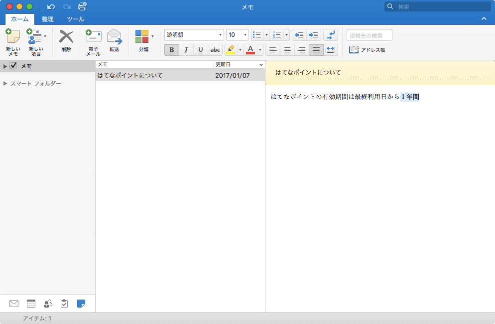 Outlook 2016 for Macではメモのテキストに太字にしたり文字の大きさを変えたり色を変えたりすることができます。ただし、ダブルクリックしてメモを開いた場合はメモの文字に書式を加えることはできません。