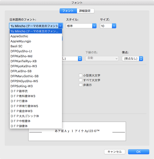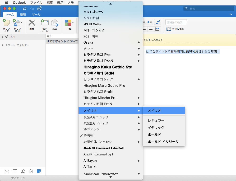 Outlook 2016 for Macのメモの既定のフォントは游明朝です。メイリオフォントにするには、メモの本文内の対象文字列を選択して[ホーム]タブの[フォント]ボックス一覧から選択、もしくは[書式]メニューの[フォント]をクリックしてフォントを変更します。フォントのダイアログボックスを表示するためのショートカットキーはcommand+Dです。