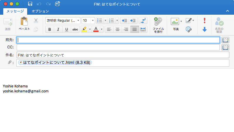 - メモアイテムのタイトルが件名に入り、HTMLに変換された添付ファイル付きの新規メールメッセージが生成されました。